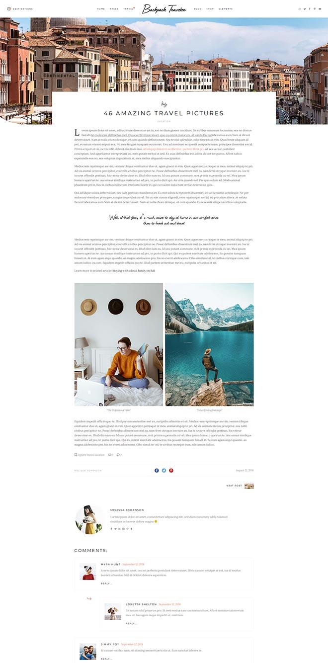 Our theme lets you integrate Google Maps on any of your pages. Not only this, but the maps are fully customizable so you can use the style that fits you the most! You can also easily pin the destinations from your posts right on the map!